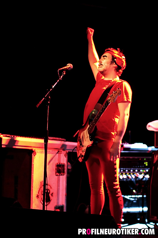 Zunächst standen also Kong aus dem UK auf der Bühne des FZW, leider noch vor ziemlich wenigen Zuschauern. Kong haben sich in Chorley, Lancashire, gegründet und bestehen unter anderen aus dem Sänger und Gitarristen Magpie, der sagt: “The whole point of this band is to provoke fear in people. Everything about this band, from the music to the costumes, isabout doing things society just wouldn’t usually allow. We only deal inextremes. We’re like the monsters from the sickest horror movie youhaven’t seen yet.” Damit mag er nicht ganz Unrecht haben, so treten Kong mit verstörenden Masken und in grellen roten Outfits auf. Sänger Magpie in einer Art roter Satin-Leggins, Bassist Lulu in roter Unterhose mit rotem Muscleshirt, was Drummer Krem an roten Sachen trug weiss ich nicht mehr. Bassist und Drummer spielen ansonsten in der Band Oceansize, deren Musik mit der von Kong aber nur wenig bis gar nichts gemein hat. Was Kong hier auf der Bühne vortragen ist ein ohrenbetäubender Sog aus Punk-Metal und Experimentellem, der seine Zuhörer ganz schön fordert.